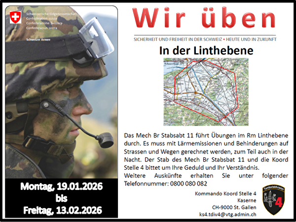 Vom 19. Januar bis 13. Februar 2026 wird der Ausbildungsplatz Linthebene durch die Armee belegt. Der detaillierte Umkreis kann dem separaten PDF entnommen werden.